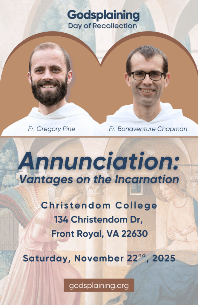 Join Fr. Gregory Pine, O.P. and Fr. Bonaventure Chapman, O.P. for a Godsplaining Day of Recollection centered on the theme: Annunciation: Vantages on the Incarnation. Through prayer, reflection, and preaching, this day will explore the mystery of the Incarnation from various theological and spiritual angles, drawing us deeper into the silence and awe of Mary’s “yes.” Whether you’re seeking clarity, renewal, or simply time with the Lord, come be refreshed in truth and grace.