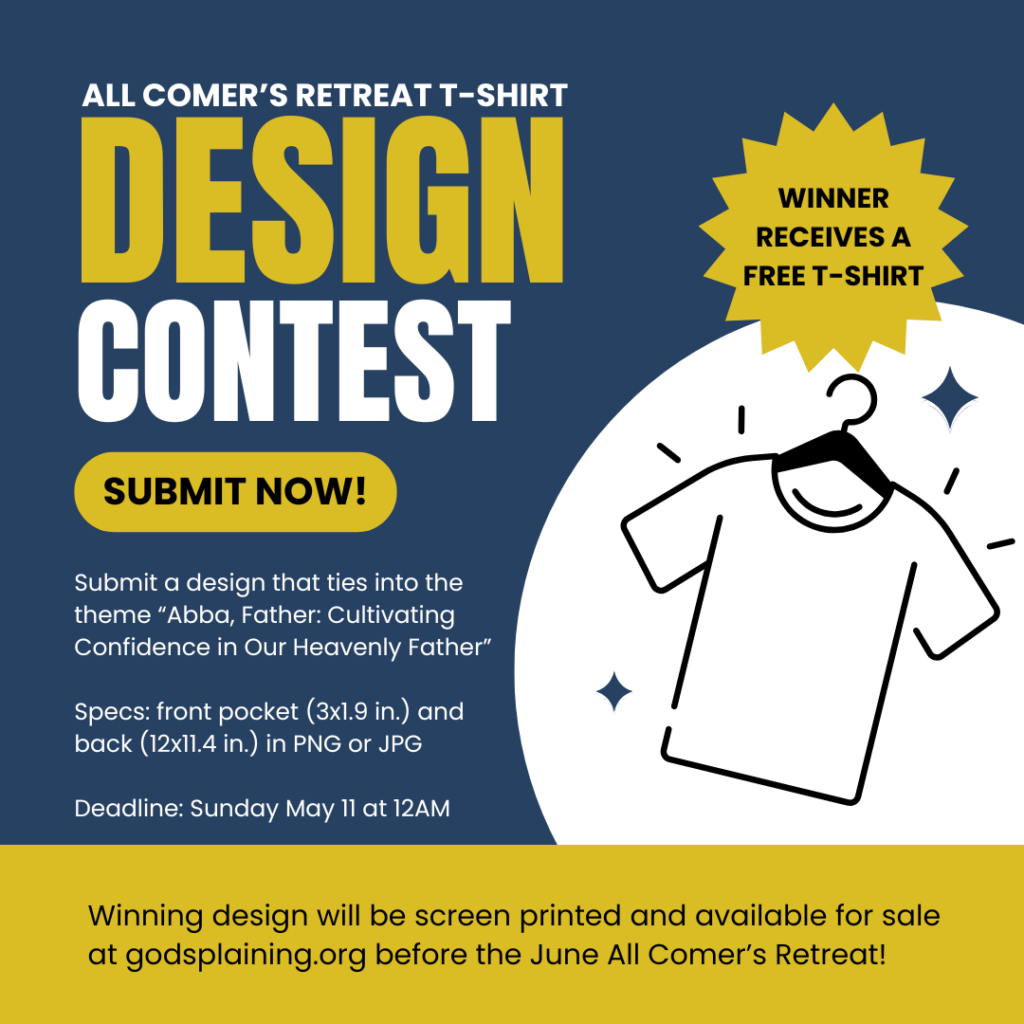 Submit your designs for a chance to be screen printed on a Comfort Colors T-shirt and made available for sale on Godsplaining.org before the retreat in June!